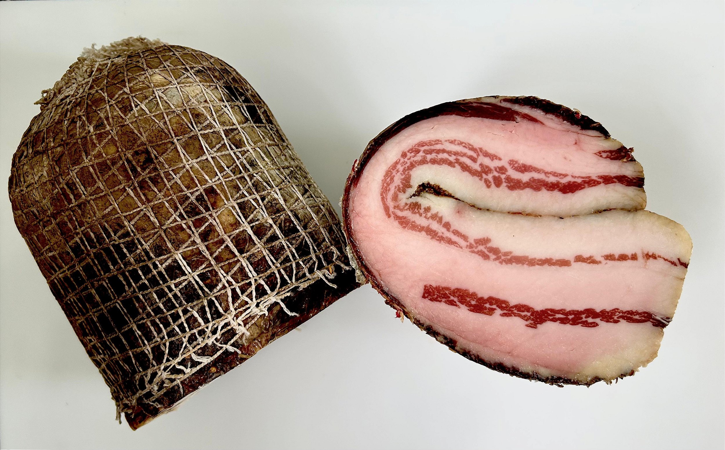 Matéria-Prima de Excelência: Pancetta feira com matriz de Porco Crioulo da raça Nilo. Animais são criados soltos, em um sistema de piquete com alimentação diversificada e natural, o que resulta em uma carne de sabor superior.